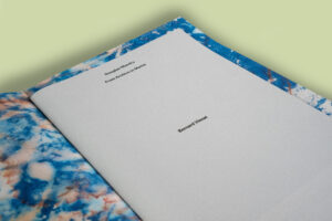 Der Umschlag besteht aus vier Seiten mit je einer Klappe vorne und hinten (offen 960 x 350 mm). Aussen wurde graues Eco Jeans-Material auf auberginefarbenes Lessebo-Papier kaschiert und im Siebdruck mit Pantone Aubergine veredelt. Der Inhalt umfasst 208 Kunstseiten auf mattem Lessebo Rough Natural und 24 Textseiten auf glänzendem Bavaria Gloss. Die Kunstseiten sind einseitig, der Textteil beidseitig im Vierfarbdruck produziert. Gebunden ist das Buch als Softcover mit Knotenfadenheftung. Umschlag und Klappen sind mehrfach gerillt und präzise eingefalzt. Die Kunstseiten wurden auf grosse Bögen geschnitten, gestanzt und nach künstlerischer Vorgabe gefalzt und eingelegt.